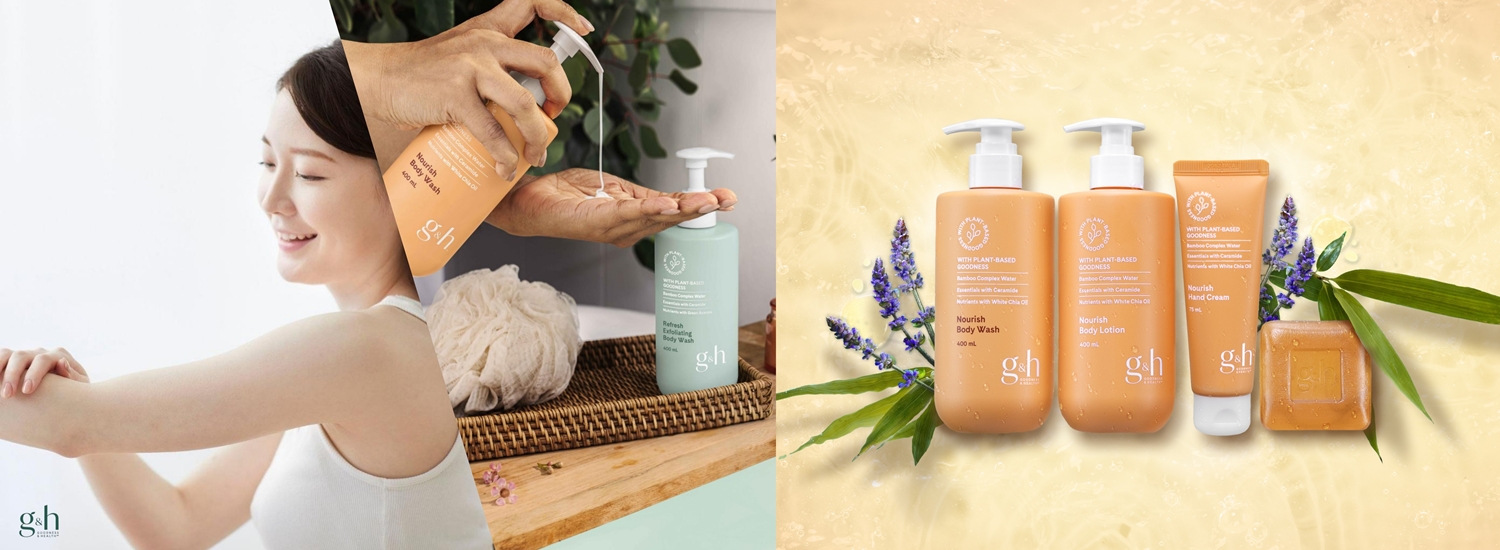 - จีแอนด์เอช กู๊ดเนส แอนด์ เฮลท์ เนอริช ครีมอาบน้ำ (G&H Goodness & Health Nourish Body Wash) ครีมอาบน้ำเนื้อฟองนุ่มละเอียด ทำความสะอาดผิวอย่างอ่อนโยน กักเก็บความชุ่มชื้นให้กับผิว พร้อมค่า pH Balance ที่ช่วยถนอมเกราะปกป้องผิว ให้ผิวสะอาดสบายไม่แห้งตึง