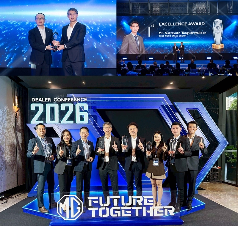 ในพิธีมอบรางวัล “MG Dealer Award 2025” ที่ได้รับเกียรติจาก มร.ต๋า เซินเซิน กรรมการผู้จัดการ บริษัท เอสเอไอซี มอเตอร์-ซีพี จำกัด เป็นผู้มอบรางวัล